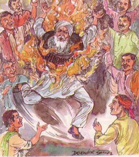 Artist's impression of the cruelty against Sikhs during the anti-Sikh riots of 1984, with a Sikh man being garlanded with a kerosene-soaked tyre while being set ablaze in front of a cheering crowd